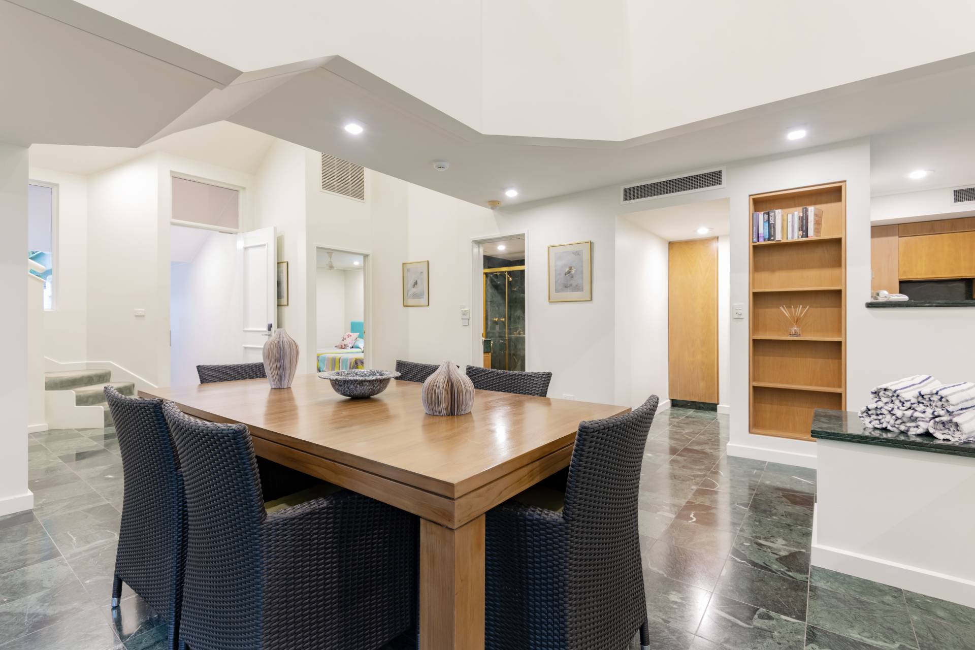 This two bedroom villa is west facing and enjoys a very rare feature being one of only two in the select group. Unlike most other two bedroom Mirage villas, being in a group of only two allows the addition of side windows to the dining area and therefore provides loads of natural light and a garden outlook and access. It also means you have only one immediate neighbour.